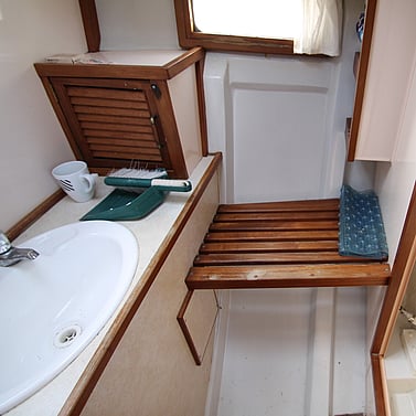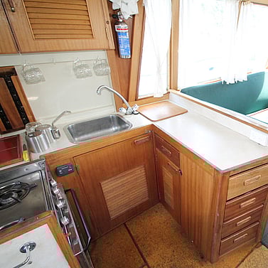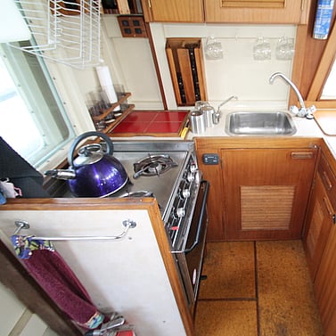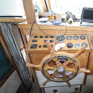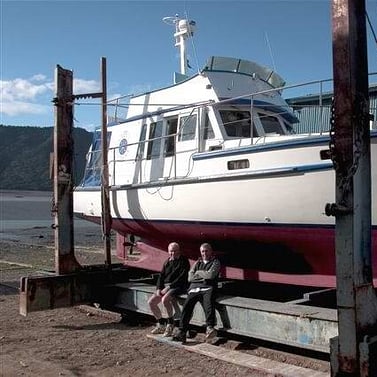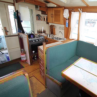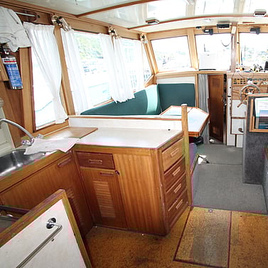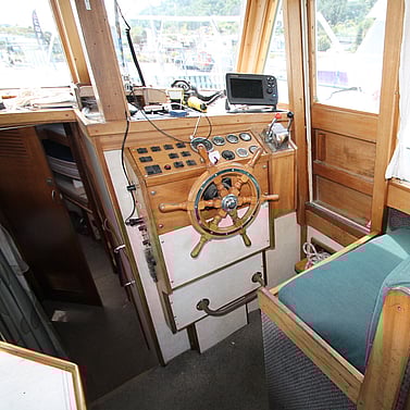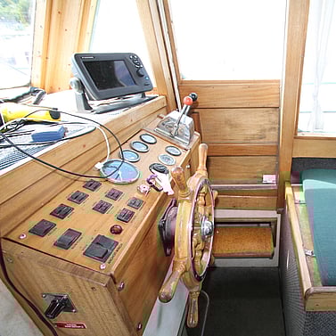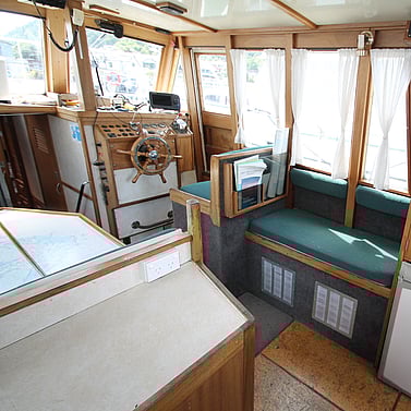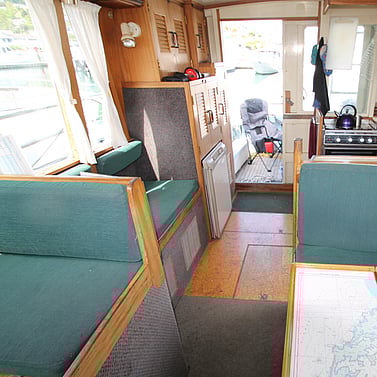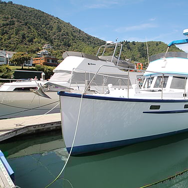 Askew 10m classic launch ‘Lady J’, a solidly built GRP hull showcasing traditional New Zealand craftsmanship with elegant lines and a warm timber interior.