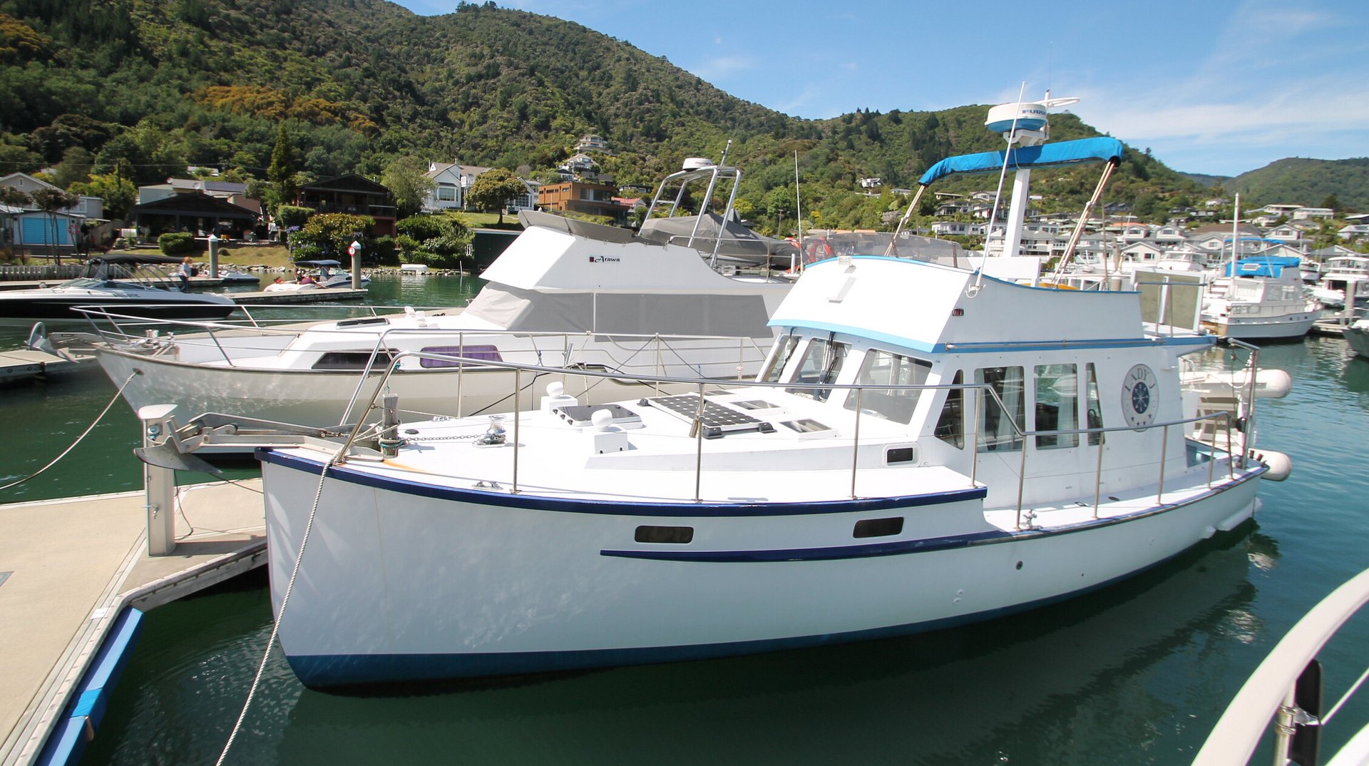 Askew 10m classic launch ‘Lady J’, a solidly built GRP hull showcasing traditional New Zealand craftsmanship with elegant lines and a warm timber interior.