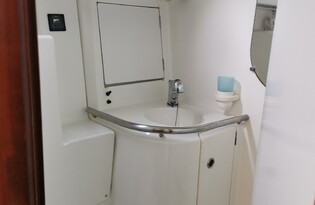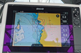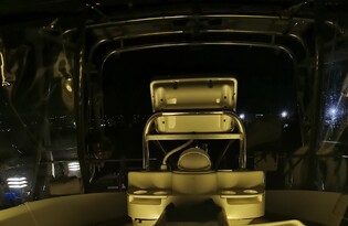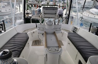 This boat also features a Bimini cover and clears around the cockpit for cold weather cruising.