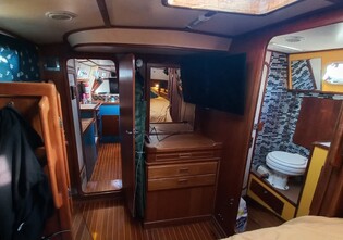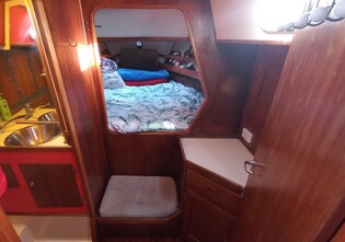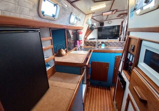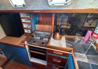 Roomy galley includes 3 burner gas stove with oven, 12v & engine driven refrigeration, engine & 240v heated hot water, Force 10 cabin heater.