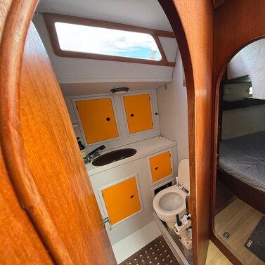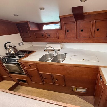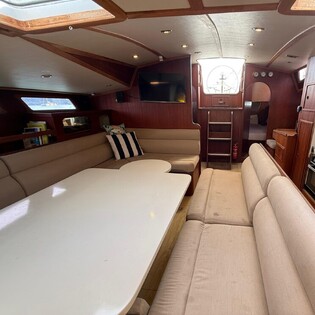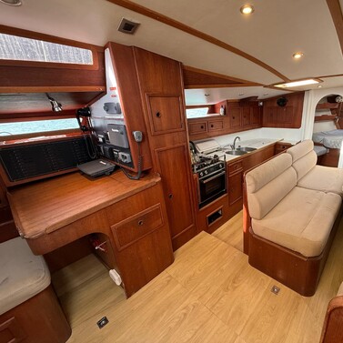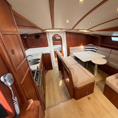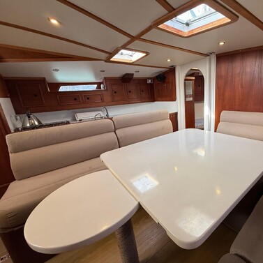 The cockpit is large, secure, and designed for easy handling, offering plenty of space for entertaining or trimming sails under way. Her layout provides comfortable accommodation with a bright, modern interior, generous saloon seating, a functional galley, and ample storage throughout.