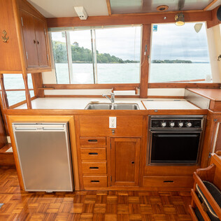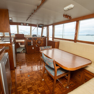 She packs plenty of benefits for a boat of this size. Boasting ample space throughout whether you are on the bow, inside the spacious saloon, or up top on the flybridge. The saloon providing great visibility with sought-after large windows. The flybridge gives not only a great viewpoint to drive from, but doubles as the perfect spot to barbeque and entertain. Add to this the ease of movement around the boat with the wide side decks giving you opportunity to fish from any angle.