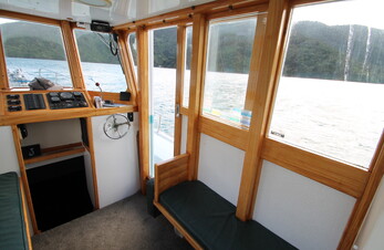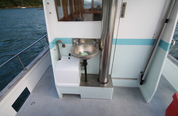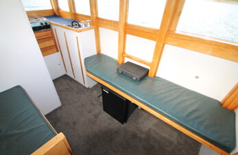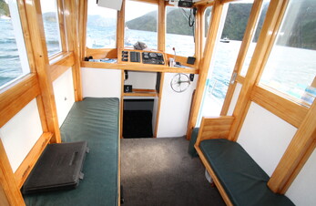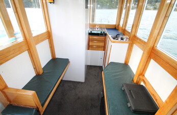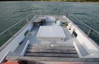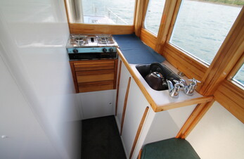 Her generous walk around decks and door by the helm make light work of berthing. Accommodation is minimal but there is an outside toilet & shower area on the aft deck, 2 burner gas stove and 12v fridge.