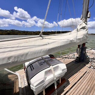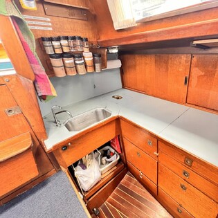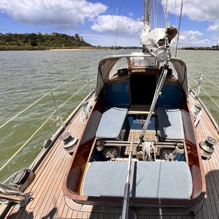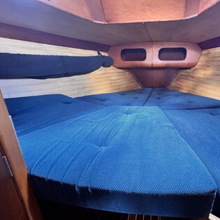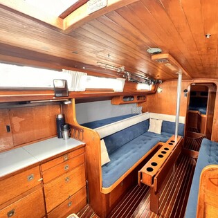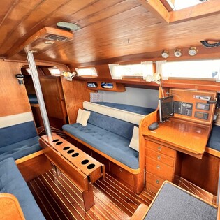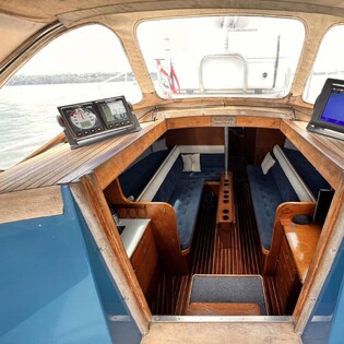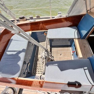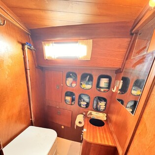 In recent years the mahogany/maple cabin floor and all the teak on deck and the cabin top have been replaced. All the above water paint has been professional painted in original colours. You'll see the same colours presented in the new fabrics down below. Extra water-/diesel tanks and all needed equipment for blue water sailing have been installed, including complete navigation Furuno electronics. A high quality Aries windvane. Latest a new life raft, new toilet. The boat is well maintained.