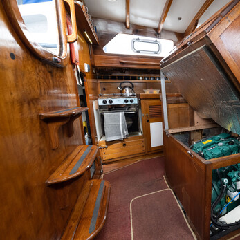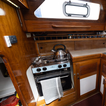 Experience a tidy, well-maintained interior. Notice a beautifully varnished Rewarewa table, complemented by cream upholstery and generous timber accents throughout. Well-placed portholes invite ample natural light, creating an inviting space to relax and enjoy life onboard. Cleverly concealed storage solutions add practicality to the charm.