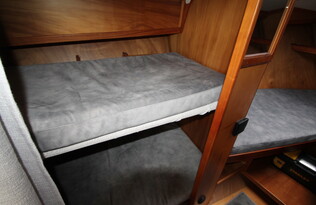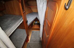This layout accommodates six people in two sleeping cabins. There is a toilet with holding tanks as well as a shower. Featuring a roomy aft galley with a gas stove, fridge, and freezer.