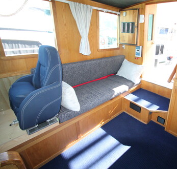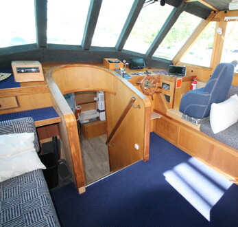 Well designed pilot house with fold away helm seat and excellent visibility.