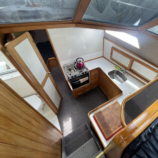 • Mid-galley with gas stove, fridge/freezer, and hot water
