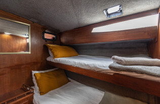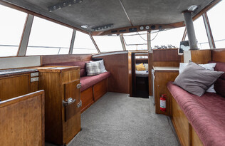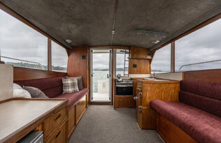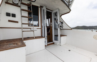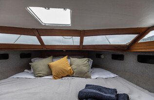Shaft driven by a four blade 370hp Volvo Penta (repowered 1999), she cruises economically at 12-15kts, burning 5-7L/h economically at cruising speed and opening up to 22kts. Her bow thruster makes her very maneuverable in close proximity. The engine is supplied by a Napa- 1150CCA battery and domestic systems are supplied by 3x 120 amp/hr Deep Cycle (Century) house batteries float charged by a 120W solar panel.